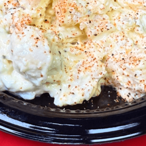 Simple red potatoes, sweet and chunky, miracle whip base with a little mustard to give it a little zing. A great compliment for any meat and our menu
