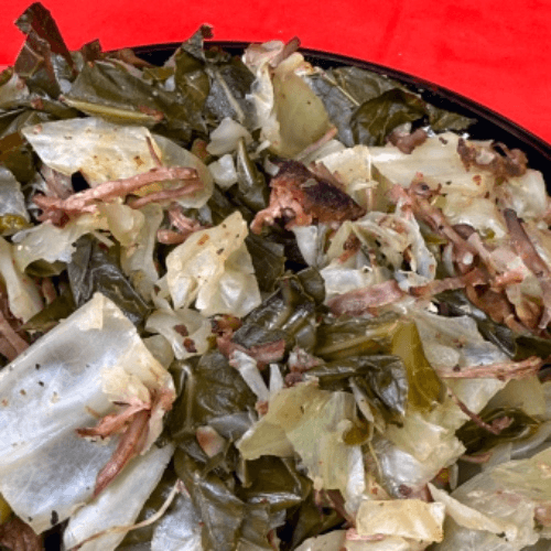 Collard greens and cabbage mixed season with our signature turkey tips