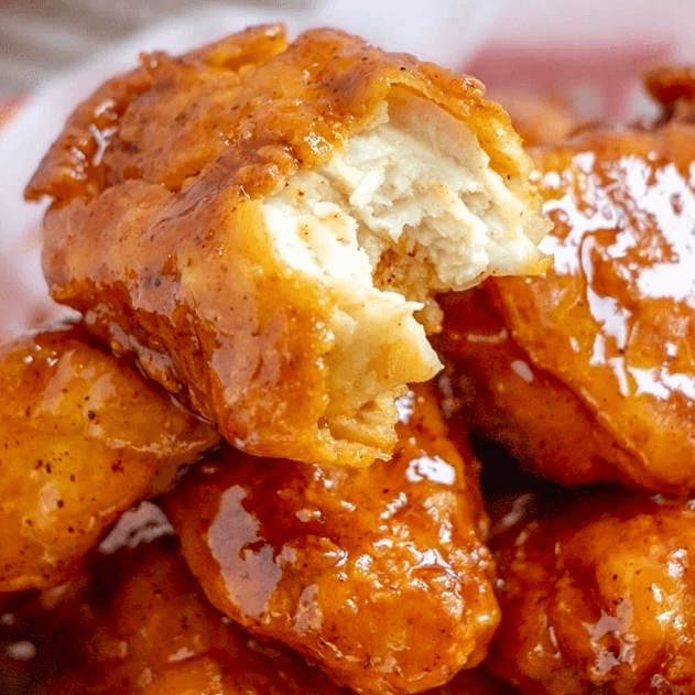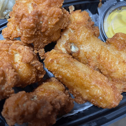 Boneless Chicken breast cut into chucks, seasoned, battered and fried to a golden brown, with roll and your choice of sauce.