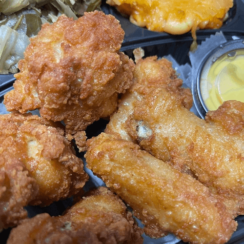 Boneless Chicken breast cut into strips, seasoned, battered and fried to a golden brown, with two side items, roll and your choice of sauce.
