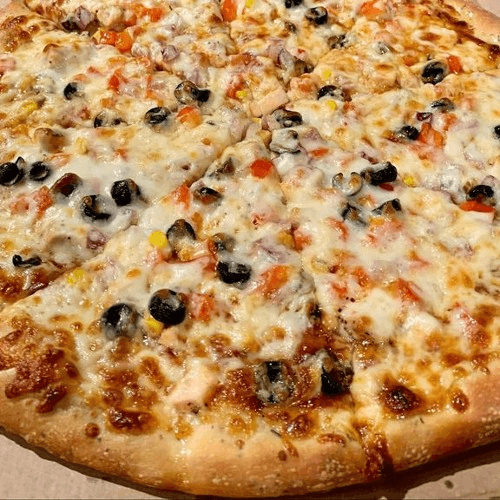 BBQ Sauce, Roasted Chicken, Red Peppers, Red Onion, Sweet Corn, Black Olives, Mozzarella