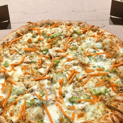 Homemade Buffalo Sauce, Roasted Chicken, Celery, Red Onions, Mozzarella & Cheddar Cheese. Topped with Scallions & a Ranch Drizzle