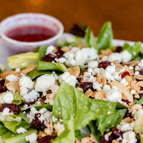 Mixed Greens, Cran Raisins, Toasted Almonds, Goat Cheese, Served with Raspberry Vinaigrette